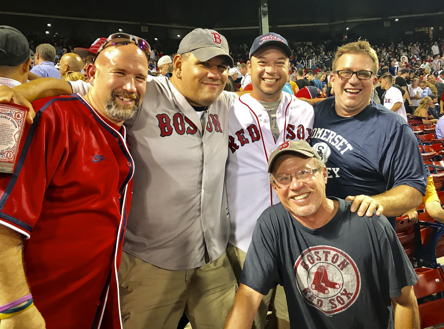Right behind us a quartet of friends from Rhode Island kept up a constant stream of banter, heckling the opposing team’s players. One batter with a bleached-blonde man-bun was nicknamed Milli Vanilli. The guys insulted each other regularly. They began calling us “Texas” when they found out where we lived — though I was quick to claim my New Hampshire origins. After the game, I joined our new friends for a group photo. As daughter Abbie said, it was like sitting in front of Tom and Ray from NPR’s “Car Talk.”