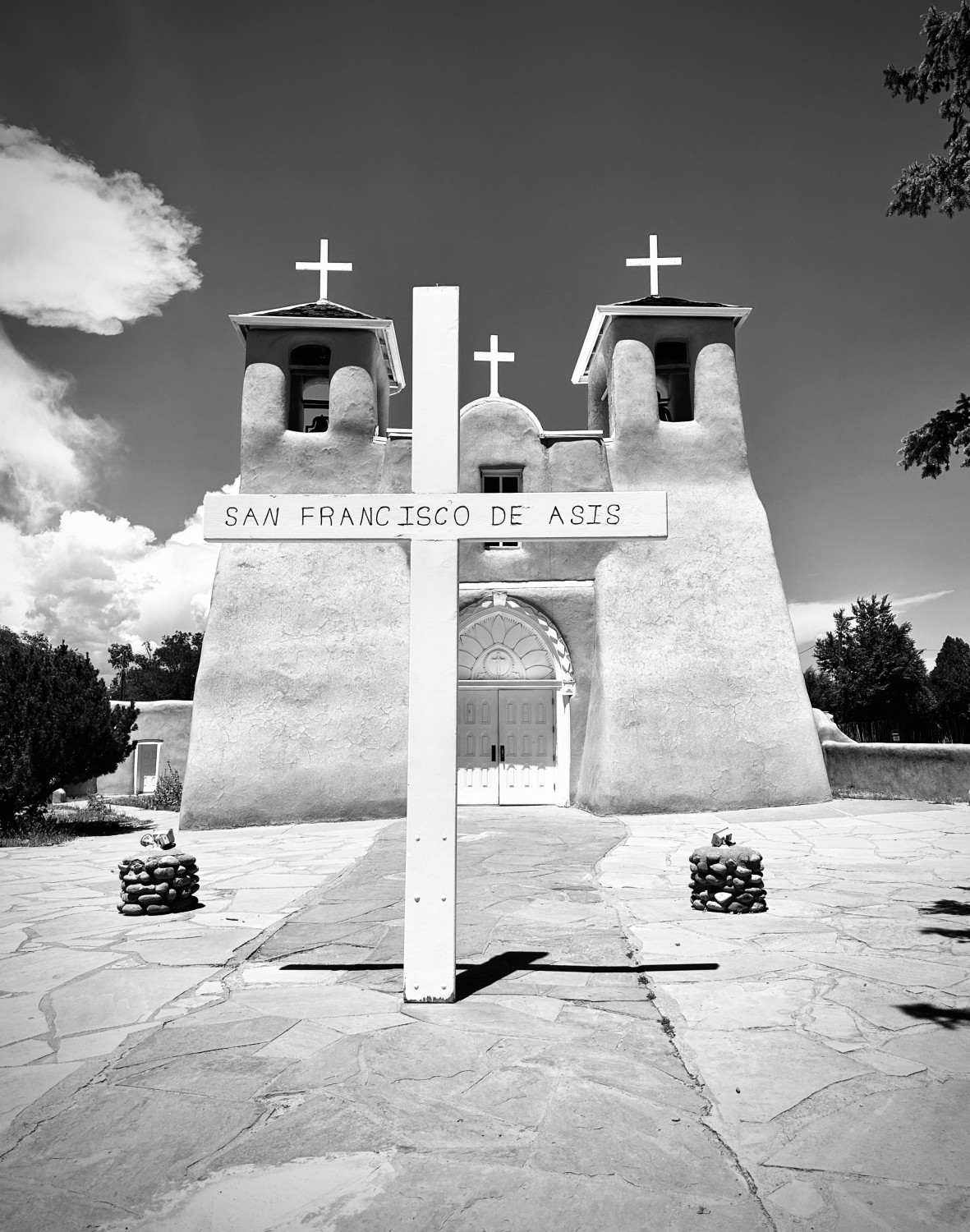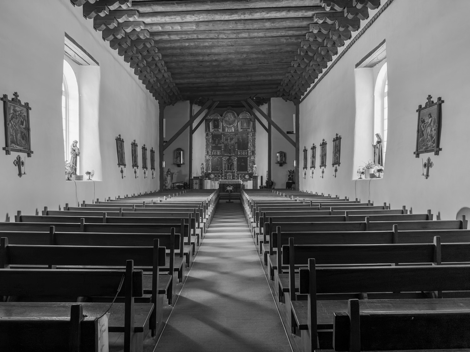 For the first time, we visit San Francisco de Asìs Church, on the main plaza of Rancho de Taos, an unincorporated village south of Taos. The still-functioning Catholic church was built between 1772 and 1816, with a full restoration completed in 1967. Artists and photographers Georgia O’ Keefe, Ansel Adams and Paul Strand all created images of this lovely church, which, of course, I am compelled to photograph. The interior is unoccupied on this Saturday afternoon, the pews illuminated by a single pair of arched windows. The thick adobe walls keep the interior cool even in the heat of summer — no air-conditioning vents intrude on the original design, though a few oscillating fans are perched on the window sills. Such a beautiful space in which to worship, I reflect.