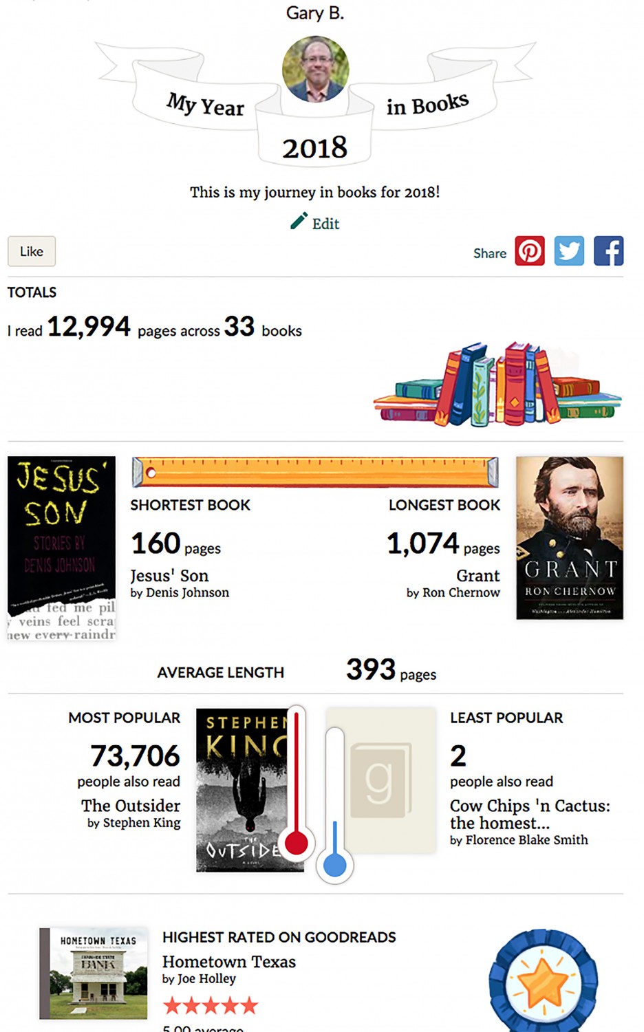 I have a few friends who also use Goodreads, and I take interest in what they’re reading since I might want to do the same. That’s the extent of my use of Goodreads. I only occasionally write brief reviews and have no interest in joining one of the 20,000-plus online book clubs or forums. But the other day, the app announced it had compiled my journey in books for 2018, so I took a look: