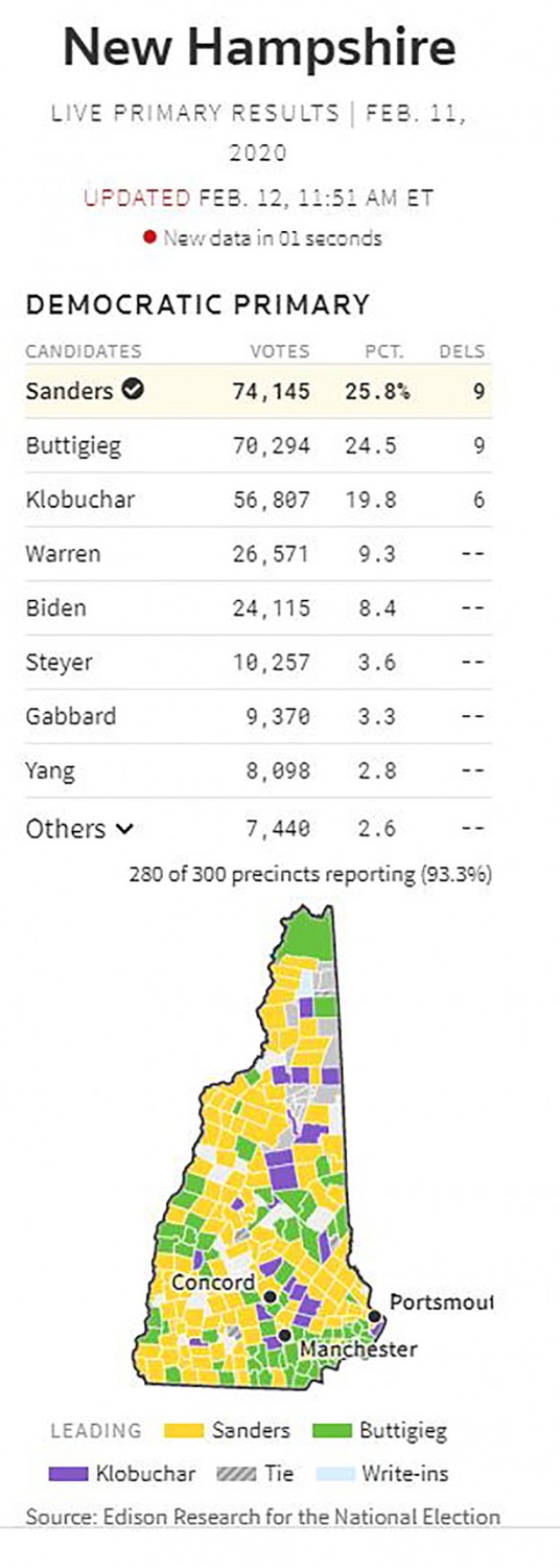 I visited a couple of N.H. newspaper websites to scope out the coverage. The Concord Monitor and the New Hampshire Union Leader generally represent the opposite ends of the political spectrum, the former on the more liberal side, the latter decidedly conservative. This year, the Monitor decided not to endorse anyone in the Democratic primary, while the Union Leader backed Minnesota Sen. Amy Klobuchar. On the Democratic ballot, voters had plenty of names from which to choose besides those who managed to make it onto the debate stages. On this 100th anniversary of the Granite State holding the first-in-the-nation primary, also running were Sam Sloan of the Bronx, Ben Gleib Gleiberman of Sherman Oaks, California, Rita Krichevsky of Lawrenceville, New Jersey and Roque De La Fuente of San Diego. A total of 33 folks were on the Democratic ballot, most of whom garnered fewer than 100 votes out of the nearly 300,000 cast. On the Republican ballot, besides the current Oval Office occupant, voters could choose from 16 other candidates, including Mr. De La Fuente, who doubled his slim chances of winning by entering both party primaries. There was also President R. Boddie of Covington, Georgia. That’s his actual name. And Bob Ely of Lake Forest, Illinois, who ran in 2012 against President Obama under the interesting slogan: Vote for the Jerk. Ely is a self-described entrepreneur and the owner of a couple of small East Texas newspapers.